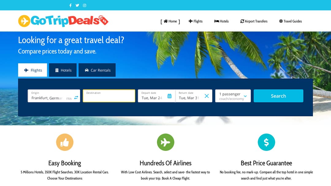 Affiliate Travel Agency Website. A travel marketplace dedicated to providing customers with a wide range of travel services through partnerships with airlines, hotels and travel agencies. GoTripDeals connects customers to the best deals anytime, anywhere.